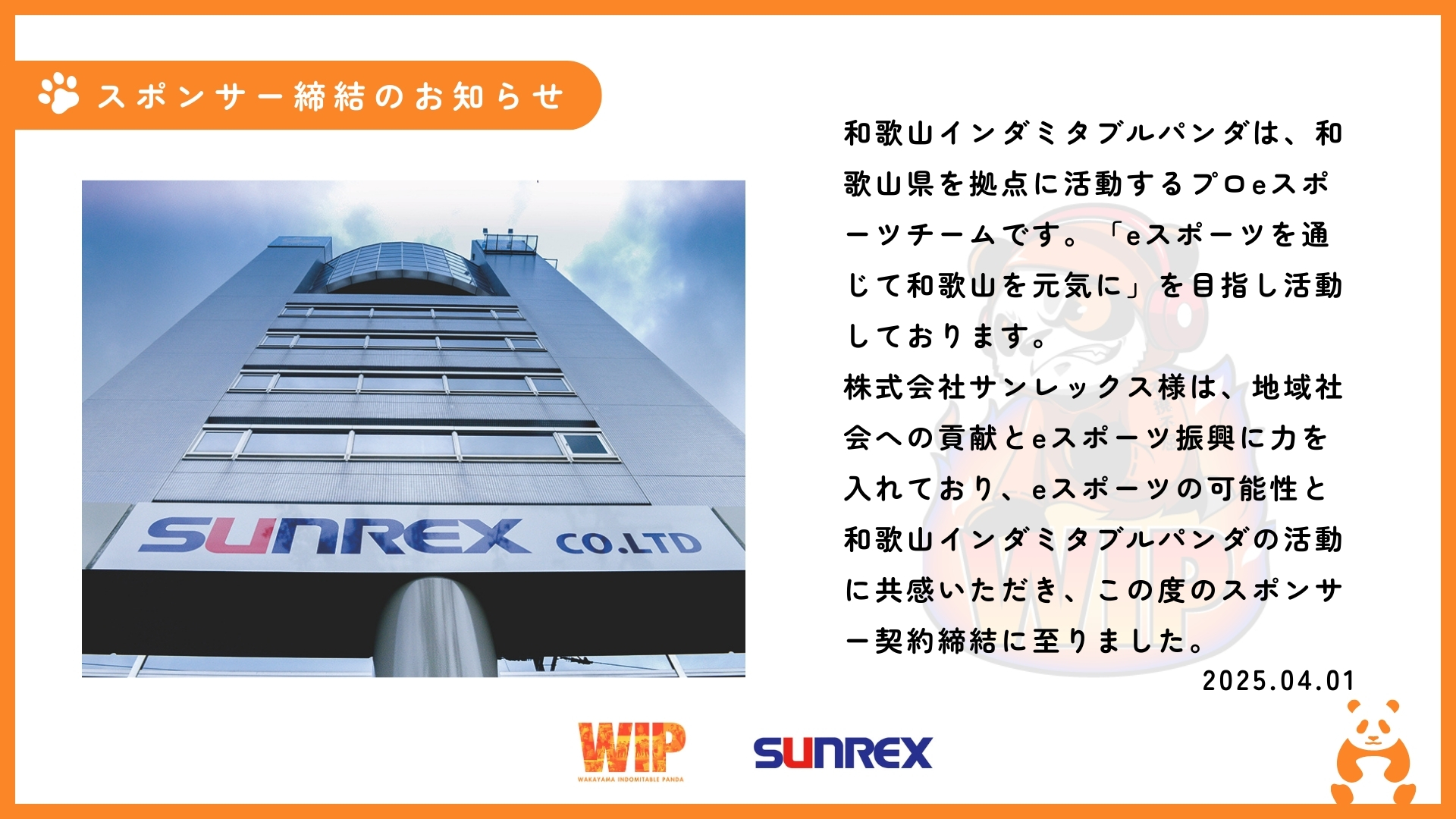 株式会社サンレックスは、和歌山県発のプロeスポーツチーム「和歌山インダミタブルパンダ(以下、WIP)」と、 2025年4月1日よりスポンサー契約を締結いたしました。