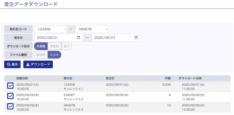 受注データ照会、受注一覧表、納品データのアップロード/ダウンロード、伝票照会が可能。