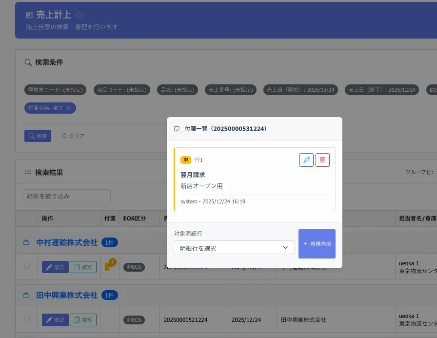 物理的な付箋と同じ要領で、伝票ごとに情報を追加で付与できます。担当者間で共有すべき申し送り事項など自由に入力が可能です。