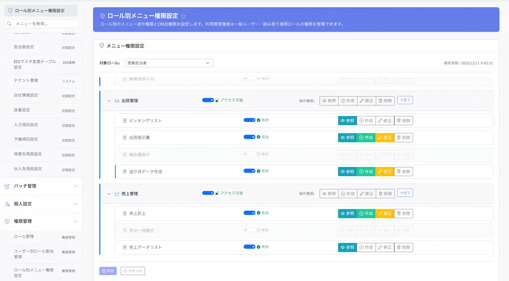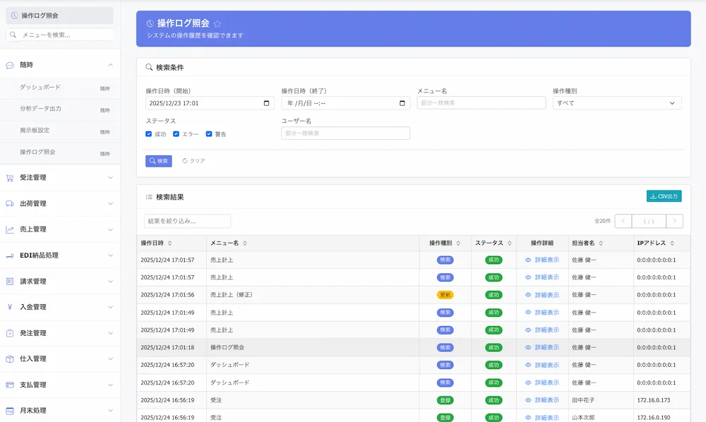 担当者別の細かな権限設定が可能。修正前後の履歴を保持するログ出力を標準装備していて、「誰が・いつ・何をしたか」を明確化します。